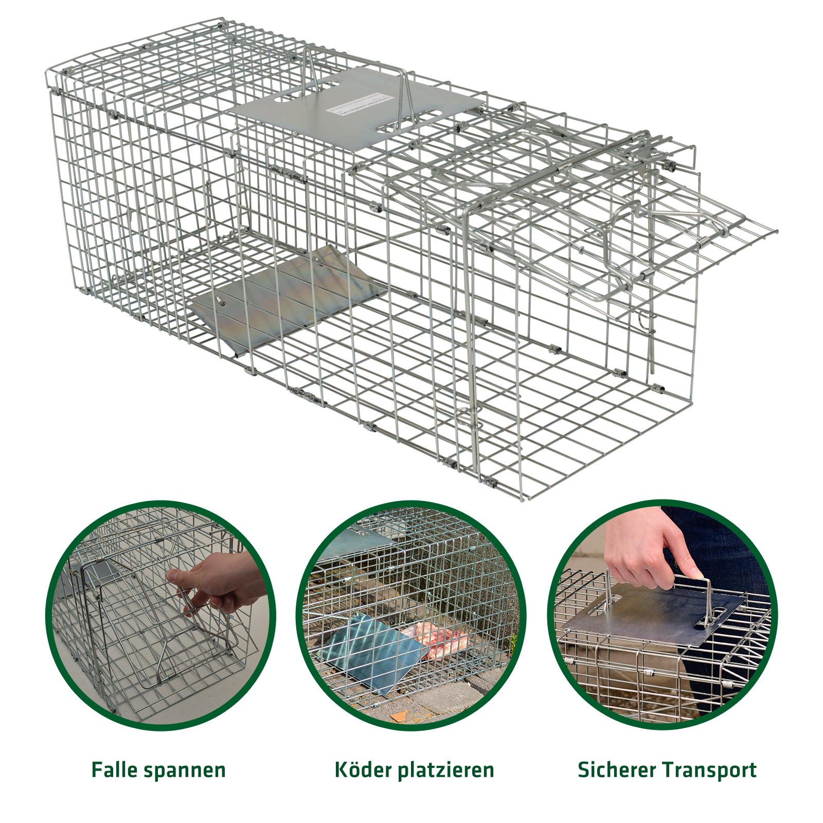 A szállítóba áthelyezéshez van egy retesz ajtó rajta biztonsági rögzítővel, így a csapdát fogáskor nem kell beszedni, csak át kell terelni a szállító zsákba/ ketrecbe.