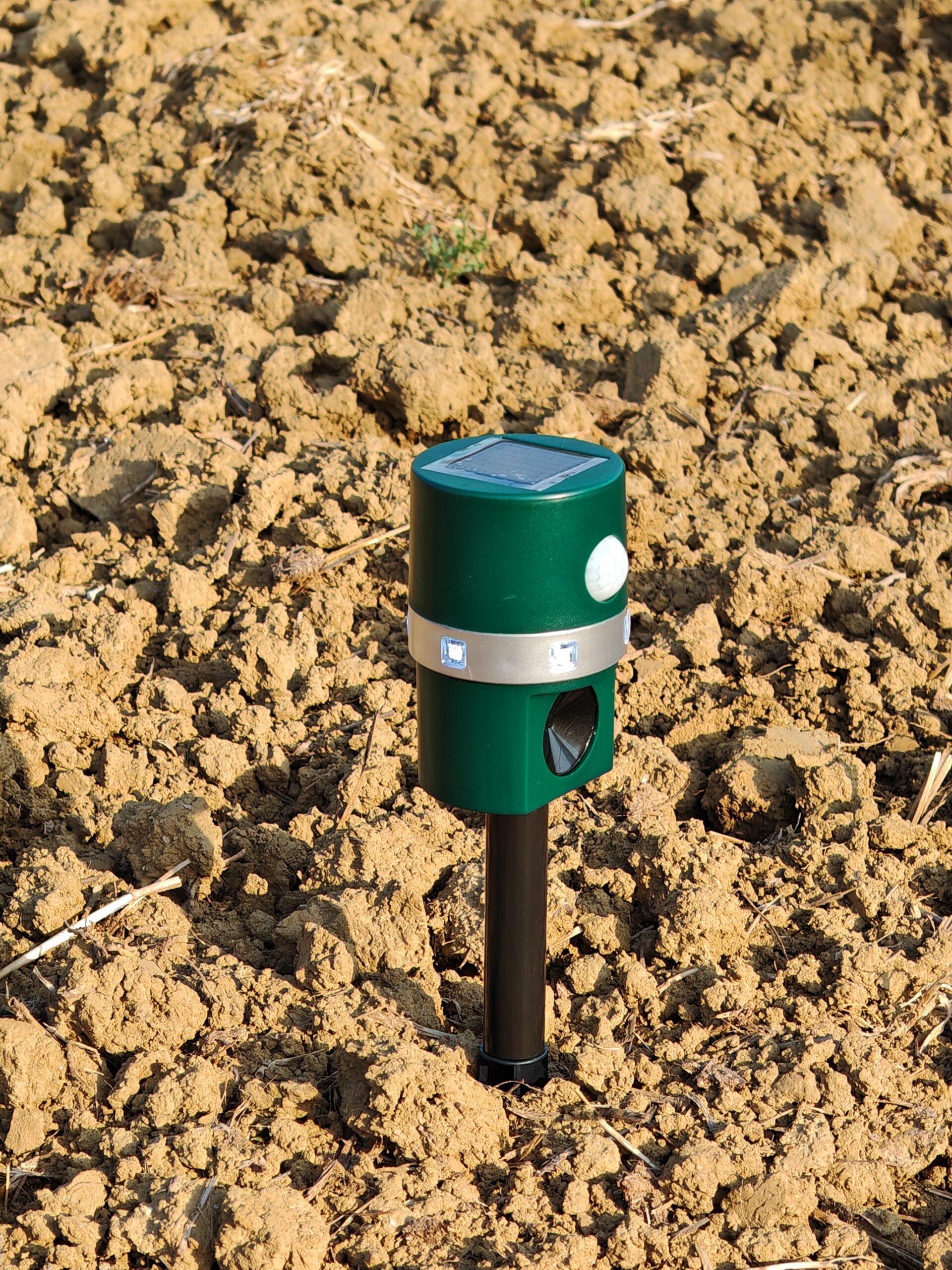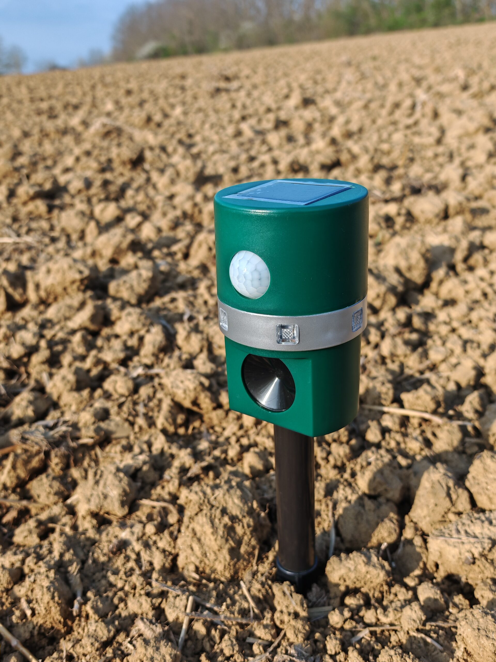Ultrahangos védelem 360°-ban. Hat körkörösen elhelyezett villogó, intelligens mozgásérzékelő, napelemes energia ellátás.
